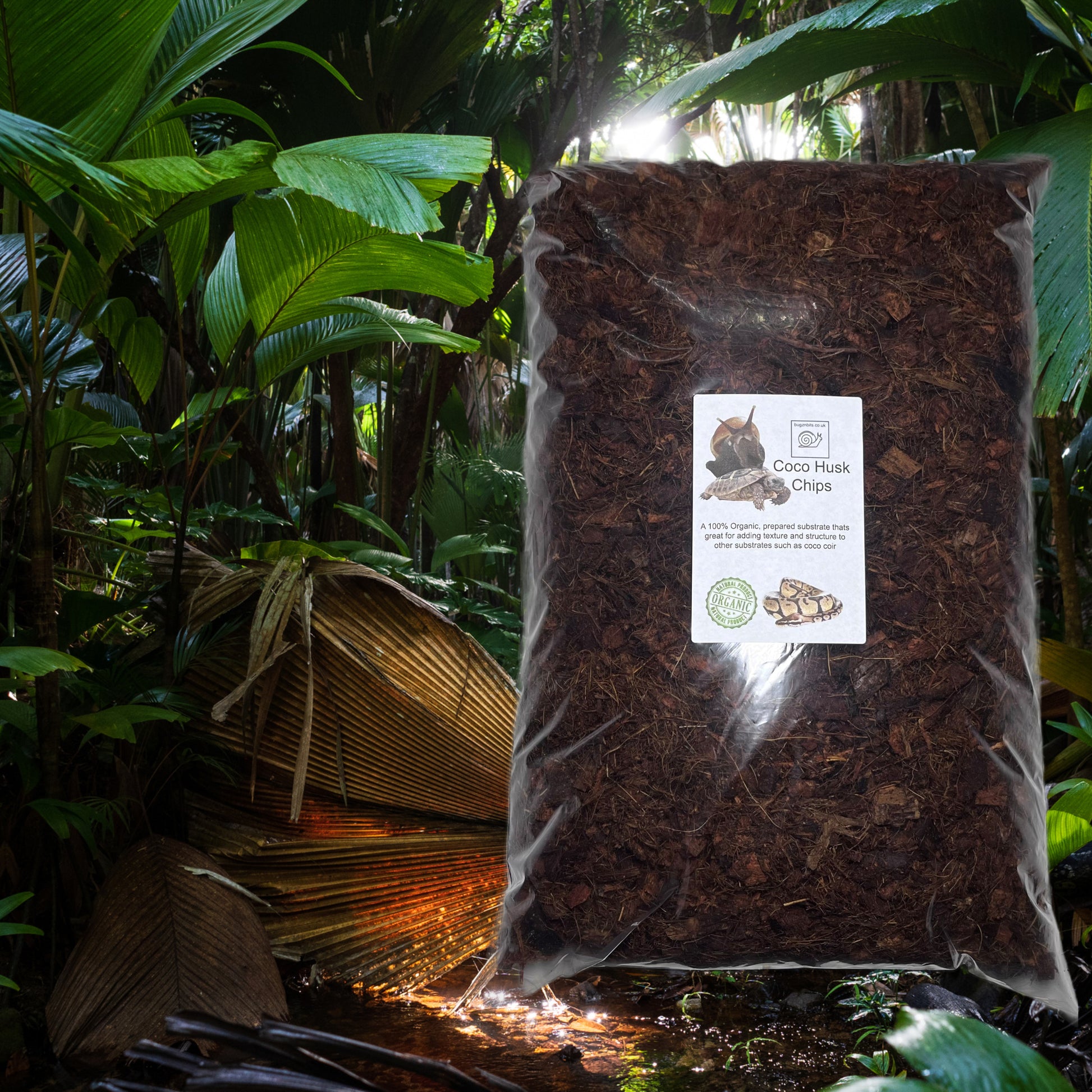 The coarse texture of husk and chip is excellent for adding body and aeration when blended with finer substrates such as coir (perfect for Giant African Land Snails) or vermiculite (commonly used with spiders). This prevents compaction, helps maintain burrows, and creates a more natural microhabitat. -